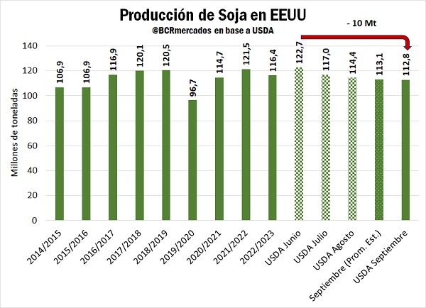 Así, si bien el maíz también perdió toneladas desde que el USDA sacó su primer número hasta la fecha, el recorte fue mucho menor: cerca de 3,3 Mt entre junio y septiembre. Asimismo, dado que el área cosechada en la 2023/24 con esta nueva revisión se ubica como la más elevada en 10 años, a pesar de no haber sido acompañado por el clima, la producción entre campañas crece más de 35 Mt en el país del norte.