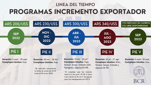 Cuando referimos que el presente Programa de Incremento Exportador se relanzó con cambios hacemos referencia no sólo a que esta vez no se trata de un tipo de cambio fijo preferencial al que los exportadores pueden liquidar sus divisas sino que admite la venta del 75% del producto de la exportación a través del MULC, al tipo de cambio oficial, y el 25% se aplica como “libre disponibilidad”; sino también al hecho que permite extender hasta septiembre del 2024 el lapso para la presentación de las respectivas declaraciones juradas de venta al exterior. Sí obliga al exportador a adelantar el 45% de los fondos aplicables al pago de derechos de exportación, incrementando así la alícuota efectiva de retenciones del programa.