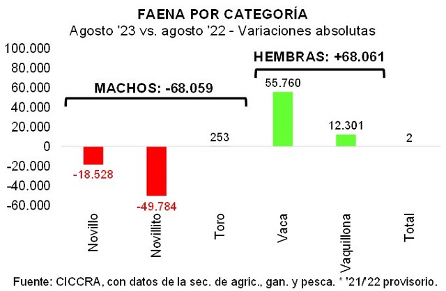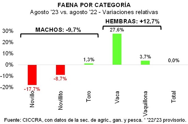 Del total faenado, 5,145 millones fueron machos. En lo que respecta a la faena de hembras, en enero-agosto de 2023 totalizó 4,704 millones de cabezas.