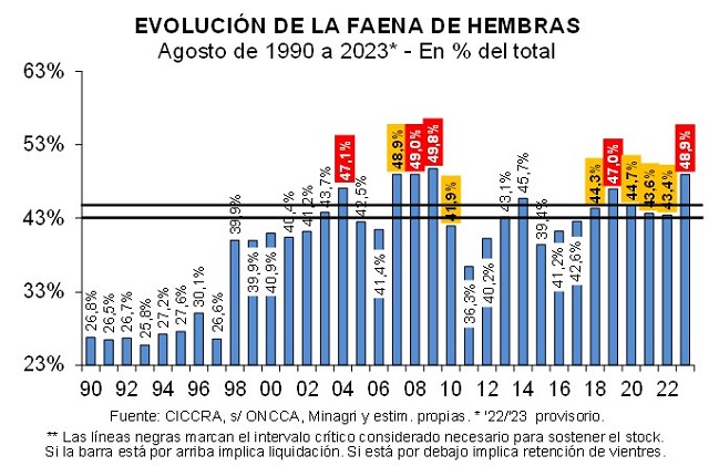 Con estos guarismos, la participación de las hembras en la faena total llegó a un pico de 48,9% en agosto de 2023 (+5,5 puntos porcentuales en relación a agosto de 2022; 4º mayor agosto de la serie histórica). Y cabe destacar que ya se cumplieron cinco meses consecutivos en los cuales la relación entre la faena de hembras y la faena total fue mayor al límite superior del intervalo consistente con el sostenimiento del rodeo vacuno.