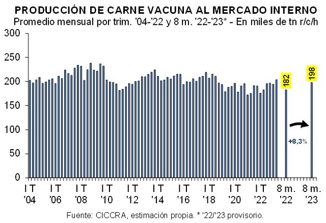 Al considerar los primeros ocho meses del año, la producción de carne vacuna ascendió a 2,227 millones de tn r/c/h. Este volumen resultó 8,4% mayor al del mismo lapso de 2022 (+172,0 mil tn r/c/h).