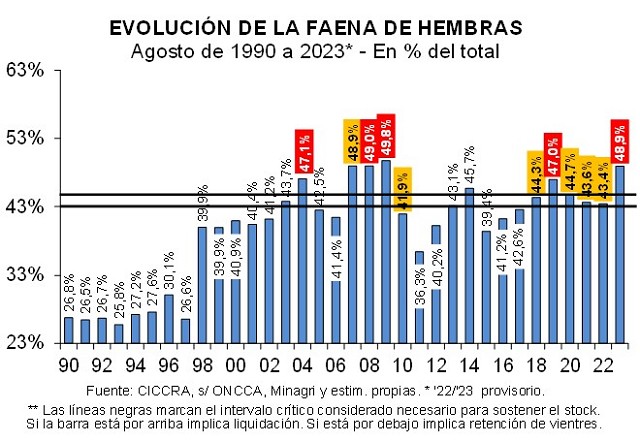 Con estos guarismos, la participación de las hembras en la faena total llegó a un pico de 48,9% en agosto de 2023 (+5,5 puntos porcentuales en relación a agosto de 2022;). Y cabe destacar que ya se cumplieron cinco meses consecutivos en los cuales la relación entre la faena de hembras y la faena total fue mayor al límite superior del intervalo consistente con el sostenimiento del rodeo vacuno.
