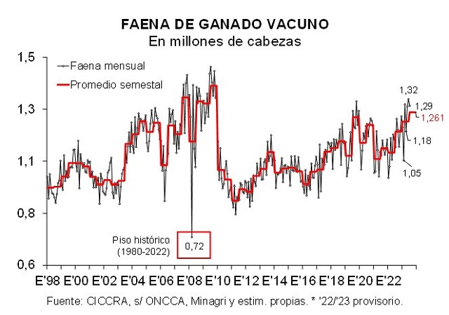 En los primeros ocho meses un total de 370 establecimientos faenó 9,85 millones de cabezas de hacienda vacuna. En la comparación interanual se registró un incremento de 11,2% (+991,6 mil cabezas). Fue el cuarto nivel de actividad más elevado de los últimos cuarenta y cuatro años.