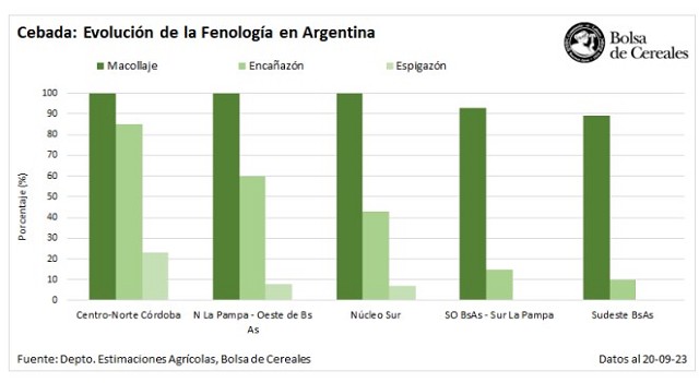 Por su parte, ante la falta de humedad en el estrato superficial que impide avanzar con las labores de implantación, se reduce la proyección de siembra de girasol 50.000 ha en las regiones NEA y Centro-Norte de Santa Fe. Esto se debe principalmente a la decisión de algunos productores de no continuar demorando la fecha de siembra. Al presente informe, el avance de siembra es del 8,8 %, y se mantiene una demora de -12,1 puntos porcentuales en comparación con el ciclo previo. Respecto al cultivo de cebada, el 77% de las 1.250.000 hectáreas implantadas se encuentran en pleno macollaje, principalmente en el sur de Buenos Aires, donde la condición hídrica de esos cuadros permitiría alcanzar su rendimiento potencial. Asimismo, el 20% de los cuadros a nivel nacional se encuentra en plena encañazón y el 1% ya ha iniciado la etapa de espigazón. Estos últimos, se concentran principalmente sobre el Centro-Norte de Córdoba y Santa Fe, Norte de La Pampa - Oeste de Buenos Aires y el Sur de Córdoba, donde la escasez de humedad durante el transcurso del ciclo del cultivo, al presente, podría comprometer los rendimientos. En consecuencia, se necesitan lluvias en las siguientes etapas, para frenar la merma en los rendimientos. Esta situación podría afectar nuestra proyección de producción.