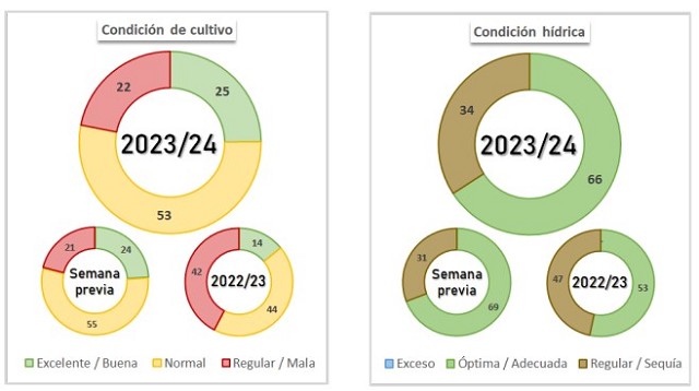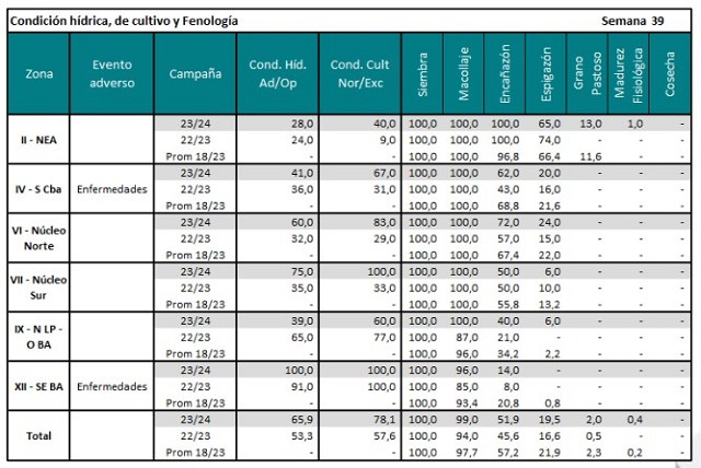 El 65,9 % del trigo se encuentra bajo condición hídrica Adecuada/Óptima. Con el 51,9 % del área transitando desde encañazón en adelante, serán necesarias lluvias que sostengan la condición de cultivo durante el llenado.