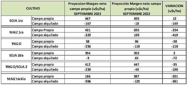 Por otro lado, en el 2022, el maíz de primera era la opción más rentable, tanto en campo propio como arrendado. Sin embargo, un año después, los números son negativos para el cereal en campo alquilado, y en campo propio la reducción de la renta es de 234 u$s/ha.