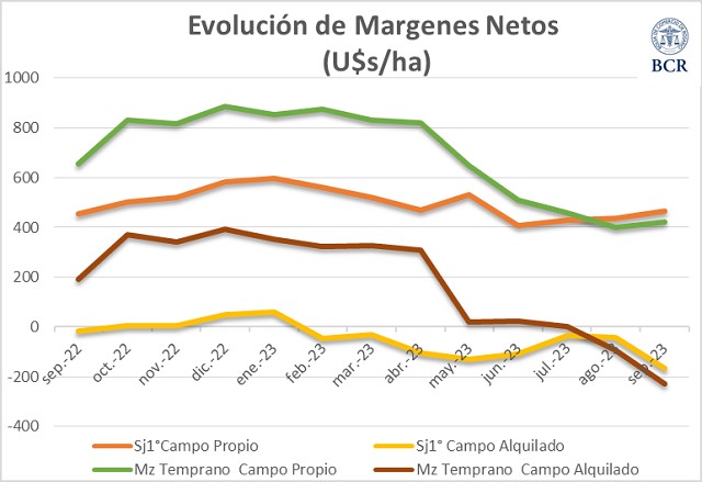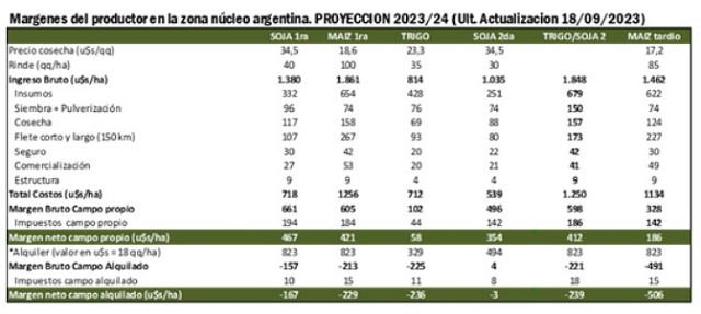 Cuando se comparan los márgenes actuales contra septiembre del 2022, todos los cultivos experimentaron una caída con excepción de la soja de primera y segunda en campo propio. Hacer soja de primera en campo propio representa una ganancia extra de 12 u$s/ha respecto de un año atrás y la de segunda apenas, 2 u$s/ha.