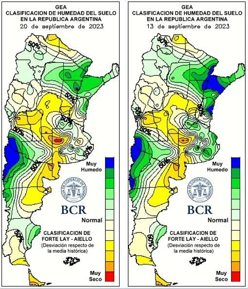 Tras las lluvias del primer fin de semana de septiembre se sembraron casi 300.000 ha. El año pasado, para esta misma fecha, el avance de siembra era tan solo de un 5% (menos de 100.000 ha). Pero el aumento de la desecación superficial del suelo pone en riesgo la concreción de los planes de siembra. En Marcos Juárez la falta de agua interrumpió las siembras, habiendo avanzado un 55% del área, “se necesita otra lluvia para poder continuar”, dicen. En Pergamino se sembró solo el 15% del maíz. La humedad superficial alcanza para pocos días más; “menos de una semana”. En esta semana comenzó la siembra en General Pinto y las labores avanzan muy lentas: solo se hizo un 5%. En el centro sur de Santa Fe, la zona que menos agua recibió en septiembre, no pudieron comenzar la siembra. En Carlos Pellegrini y El Trébol siguen con gran expectativa las posibilidades de lluvias para poder arrancar. Esperarán, como máximo, hasta mediados de octubre.