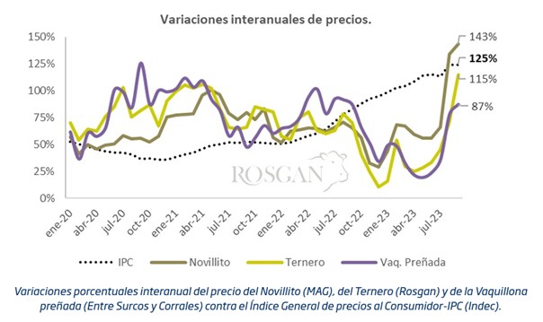 Hasta entonces, el precio del novillito terminado en el MAG acumulaba retrasos de más del 60% interanual respecto del promedio general de precios, medido a través del IPC. En agosto, el promedio de la categoría logró registrar una variación interanual del 134% ubicándose unos 10 puntos por sobre el 124,4% que marcó la inflación interanual a ese mes. En lo que va de septiembre -asumiendo un IPC mensual similar al registrado el mes previo- si bien en promedio esa brecha continúa ampliándose a unos 19 puntos porcentuales, la tendencia de precios registrados en las últimas jornadas en el MAG muestra un ligero quiebre a la baja.