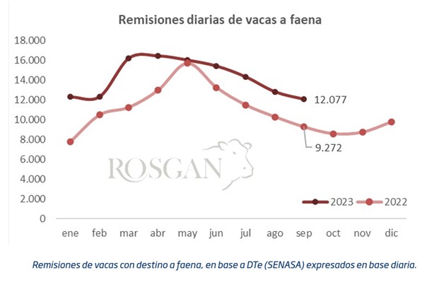 De momento, la faena de vacas que para esta altura del año debería mostrar una reducción más pronunciada, continúa fluctuando en niveles elevados. Si bien el ritmo de faena de julio y agosto ha caído, los datos de septiembre -expresados con base diaria- sugieren cierto amesetamiento, ubicándose 30 puntos por arriba de niveles registrados a esta misma fecha, un año atrás.