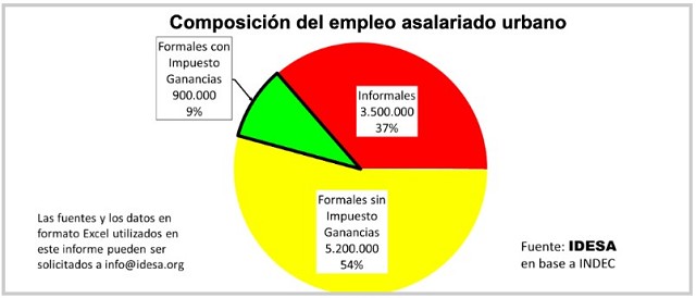 Estos datos muestran que los asalariados alcanzados por el impuesto a las ganancias ya constituían, antes del cambio, una pequeña elite dentro del mercado de trabajo. Más de un tercio de los asalariados trabaja en la informalidad cobrando en la mayoría de los casos remuneraciones inferiores a la línea de pobreza. Más de la mitad de los asalariados es formal pero cobra salarios bajos en parte porque casi la mitad del costo laboral se destina a cargas sociales (una imposición no progresiva). En este sentido, las evidencias son claras en que aplicar una baja de la carga tributaria para el 10% restante de los asalariados, que son los de mayores ingresos, resulta extremadamente regresivo.