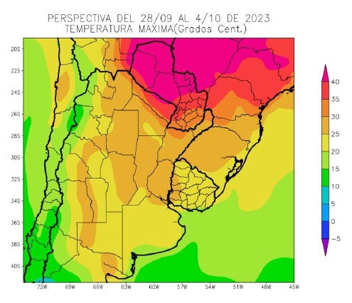• La Mayor parte del Paraguay, el norte de la Región del Chaco y el norte de la Mesopotamia observarán temperaturas máximas superiores a 30°C, con amplios focos de registros por encima de 40°C. • El este del NOA, gran parte de la Mesopotamia, el norte y el oeste de la Región Pampeana y el oeste del Uruguay observarán temperaturas máximas superiores a 25°C con focos con valores de 30 °C. • El centro del NOA, la mayor parte de Cuyo, la mayor parte de la Provincia de Buenos Aires y la mayor parte del Uruguay observarán temperaturas máximas entre 20 y 25°C, con focos de valores superiores. • El oeste del NOA y el sur de la Provincia de Buenos Aires experimentarán máximas inferiores a 20°C.