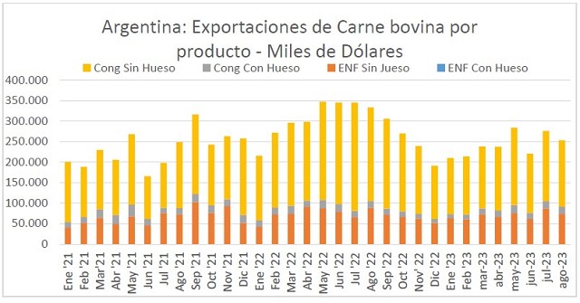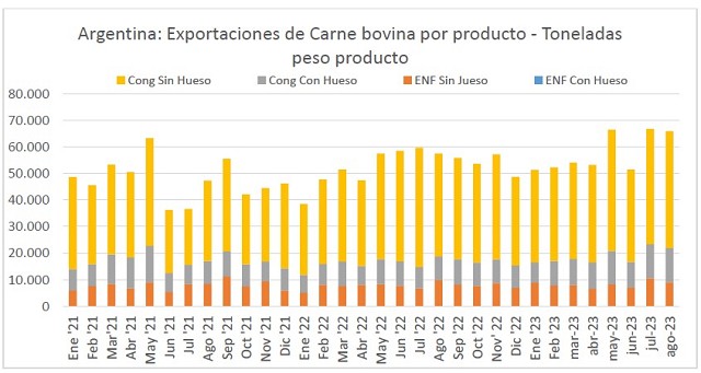 Las exportaciones de carne bovina del mes de agosto de 2023 resultaron equivalentes a 93,0 mil toneladas res con hueso; y el acumulado de los primeros ocho meses del año trepa a 653,8 mil toneladas res con hueso. Los volúmenes exportados en agosto representaron un 33,4% de las cerca de 278,7 mil toneladas res con hueso producidas en el período. El acumulado de los últimos doce meses de actividad, desde septiembre de 2022 hasta agosto de 2023, muestran exportaciones totales de carne bovina refrigerada y congelada por un volumen de 676,5 mil toneladas peso producto, equivalentes a 960,5 mil toneladas res con hueso; y un valor monetario obtenido cercano a 2.941 millones de dólares.