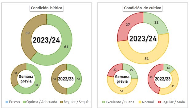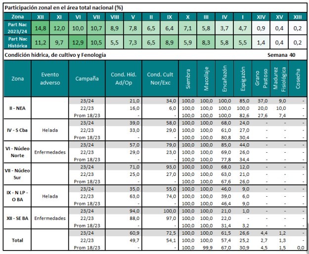 Del área en pie, un 5,5 % se encuentra en llenado de grano, un 13,1 % en espigazón y un 73,4 % entre macollaje y encañazón. El 72,5 % del trigo presenta condición de cultivo Normal a Excelente.