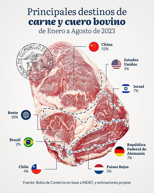En lo que va del año 2023 más de la mitad de lo exportado en valor del complejo carnes y cuero bovinos tuvo como destino China con más de 1.263 millones de dólares sobre un total de US$ 2.437 millones. También se destacan las exportaciones del complejo hacia a Alemania, Países Bajos, Israel, Estados Unidos, Chile, Brasil, entre otros.