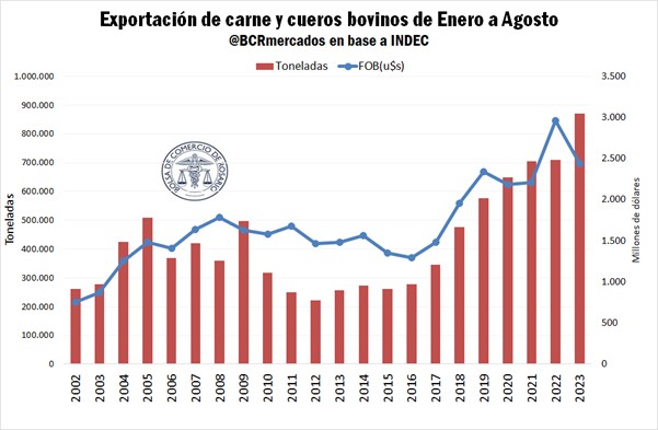 En total, en el período enero-agosto 2023, Brasil generó US$ 6,6 mil millones en exportaciones de carne de res, lo que representó una disminución del 22,0%, de acuerdo con datos de la Asociación Brasileña de Industrias Exportadoras de Carne (ABIEC). Del valor exportado, más de la mitad (54%) tiene como destino de exportación China. En volumen, Brasil exportó a China en dicho período 719.303 toneladas, un 8% menos que el tonelaje exportado durante la misma etapa del año en 2022.