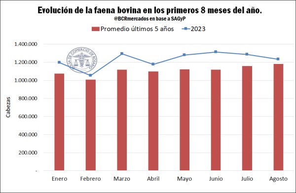 El siguiente gráfico compara la faena mensual del año 2023 con el promedio de los últimos cinco años para cada mes. En el mismo puede observarse que sin excepción el número de cabezas faenadas ha sido superior al promedio en todos los meses, con datos hasta el mes de agosto inclusive.
