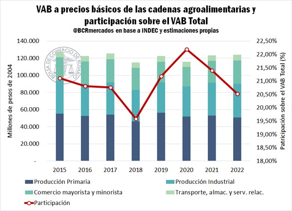 Las cadenas agroalimentarias explicaron 1 de cada 5 pesos del PBI argentino en 2022. El VAB agroalimentario alcanzó en 2022 un estimado de 123.988 millones de pesos de 2004, creciendo un 0,6% respecto del valor alcanzado en 2021. Esto equivale al 20,5% del PIB argentino de 2022.
