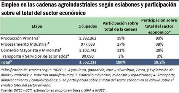 El total de empleo estimado generado por las cadenas agroindustriales y agroalimentarias en el 2022 fue de 3.562.223 puestos de trabajo, lo que representa el 19,2% del empleo privado del país. De este total, 1.392.362 (el 39%) personas están empleada en el sector primario, 977.038 lo están en el sector secundario (el 27%), 1.102.743 (el 31%) en el comercio mayorista y/o minorista de productos alimentarios y 90.090 (el 3%) personas están empleadas en el transporte de cargas y servicios relacionados.