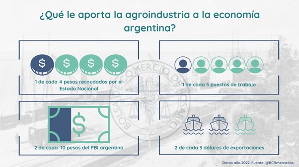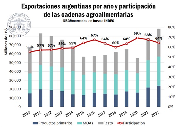En el 2022, las cadenas agroalimentarias generaron exportaciones por casi US$ 57.000 millones, un récord histórico medido en dólares corrientes. Esto se vio explicado principalmente por un fuerte aumento en los precios de exportación de los principales productos del sector, que tuvieron un fuerte impulso producto de la guerra desatada hacia principios del año previo entre Rusia y Ucrania. De esta manera, el agro y las cadenas que lo componen explicaron 65 de cada 100 dólares que ingresaron al país por exportaciones de bienes.