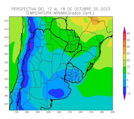 La perspectiva comenzará con tiempo frío, debido a la entrada de aire polar en los días precedentes, con heladas generales en el extremo oeste del área agrícola y heladas localizadas y generales en las Serranías Bonaerense, pero sin llegar hasta el trópico. A continuación, los vientos del trópico se extenderán sobre el norte del área agrícola, donde producirán máximas muy elevadas, llegando con menor energía al centro y el sur, que observarán registros sobre lo normal pero no extremos, mientras la franja atlántica recibirá vientos marinos que producirán registros bajo la media estacional. Paralelamente, se producirán precipitaciones de frente caliente, sin que baje apreciablemente la temperatura, con registros abundantes en el norte y nordeste del área agrícola, pero con aportes escasos a nulos en el resto de su extensión, salvo una franja con lluvias moderadas sobre el sur de La Pampa y Buenos Aires.