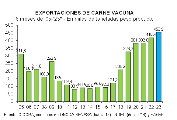 En enero-agosto de 2023 las exportaciones de carne vacuna argentina totalizaron 453,9 mil tn pp y fueron equivalentes a 651,0 mil tn r/c/h. En relación a enero-agosto de 2022 se observaron crecimientos de 8,5% y 9,4%, respectivamente. A China se dirigieron casi 8 de cada 10 kilos de carne vacuna exportados. En lo que respecta a los productos exportados a nivel general, 85,3% correspondió a cortes congelados (78,5% de cortes sin hueso) y 14,3% a cortes frescos sin hueso.