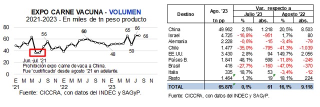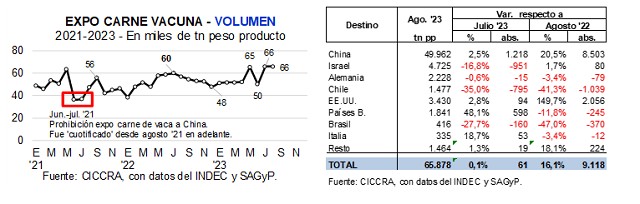 En agosto de 2023 el volumen exportado de carne vacuna se mantuvo en los elevados niveles de mayo y julio, tal como se puede observar en el correspondiente gráfico. En total se exportaron 65,9 mil toneladas peso producto (tn pp) de carne vacuna, apenas 0,1% más que en julio y 0,8% más que en mayo. Del total, 75,8% fue enviado a China. En tanto, en relación a agosto de 2022 se registró un incremento de 16,1% (+9,1 mil tn pp). Los ingresos generados fueron equivalentes a 253,7 millones de dólares, los cuales resultaron 24,0% menores a los de agosto del año pasado. Fue la gran caída del precio promedio de exportación el factor explicativo (-34,5% anual).