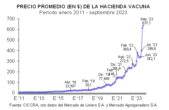 Al comparar los valores de septiembre de 2023 con los de septiembre de 2022, surge el reacomodamiento de los mismos a la realidad inflacionaria del país. En los últimos doce meses el precio del kilo vivo de hacienda vacuna registró una suba de 135,7%, reduciéndose la caída en términos reales a 3,2% anual. Los aumentos más importantes correspondieron a los novillos (144,9%), toros (136,4%) y vaquillonas (135,3%), los cuales fueron seguidos muy de cerca por los novillitos y vacas (134,9% y 134,8%, respectivamente), y en última lugar por los MEJ (127,9%).