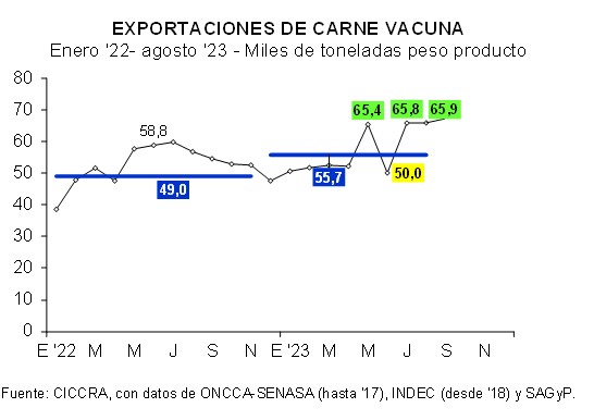 Expresadas en toneladas res con hueso (tn r/c/h), las exportaciones de agosto de 2023 fueron equivalentes a 92,6 mil toneladas. Este volumen fue similar al de julio y mayo de este año, en línea con lo señalado más arriba, pero fue 12,9% mayor en relación al registrado en agosto de 2022. El precio promedio por tn r/c/h se ubicó en 2.741 dólares en el octavo mes del año, resultando 32,7% inferior en términos interanuales.