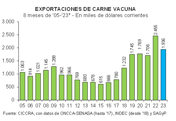 A Chile se exportaron 12,46 mil tn pp de carne vacuna, es decir 17,0% menos que en primeros ocho meses de 2022 (2,7% del total). Y el precio promedio descendió 4,0% anual, ubicándose en 7.421 dólares por tn pp. Esto hizo que la facturación descendiera a 92,5 millones de dólares (-20,3% anual; 4,8% del total).