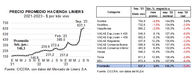 En el noveno mes del año el precio promedio de la hacienda se ubicó en $ 637,1 por kilo vivo en el mercado de Cañuelas, tal como se puede observar en los gráficos y cuadro precedentes. La suba mensual fue de 3,9%, producto de nuevas subas en los valores de toros (12,9%), vacas (10,4%) y MEJ (4,5%), las que se compensaron sólo parcialmente por disminuciones en los precios promedio de vaquillonas (-2,9%), novillitos (-1,5%) y novillos (-0,8%). La apertura de la categoría vacas mostró que las alzas más importantes correspondieron a las regulares (12,2%) y a las conserva buena (10,9%) e inferior (9,0%). En tanto, en el caso de las vacas especiales jóvenes de más de 430 kilos, el precio subió 8,3% en el mes, y en el de las de hasta 430 kilos, el valor promedio aumentó 8,1% mensual.