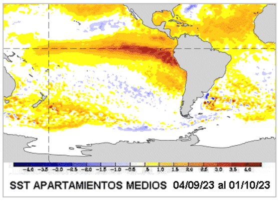 A pesar de la escasez de precipitaciones en la franja central del país, el fenómeno de El Niño se muestra activo en una vasta zona del sudeste de Sudamérica. Las lluvias del norte de la Mesopotamia responden a esa influencia positiva y mantienen, aunque en forma más moderada, el patrón del mes septiembre. Esta conclusión se consolida si tenemos en cuenta el patrón pluvial que se mantiene sobre el sur de Brasil y la franja oriental de Paraguay. Esta es una zona con fuerte respuesta estadística hacia los desvíos positivos de la precipitación, lo cual se está validando. De la misma manera, esta respuesta debería ser influyente más hacia el sur tomando la región pampeana, a medida que avancemos sobre Octubre y Noviembre. Una vez que comience a notarse esta influencia, la misma tiene posibilidades de sostenerse por el resto del semestre cálido.