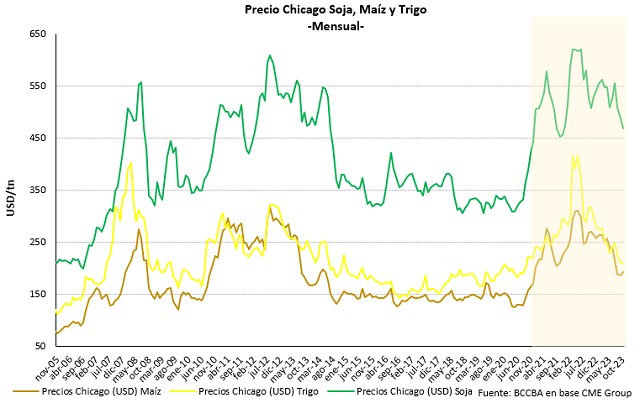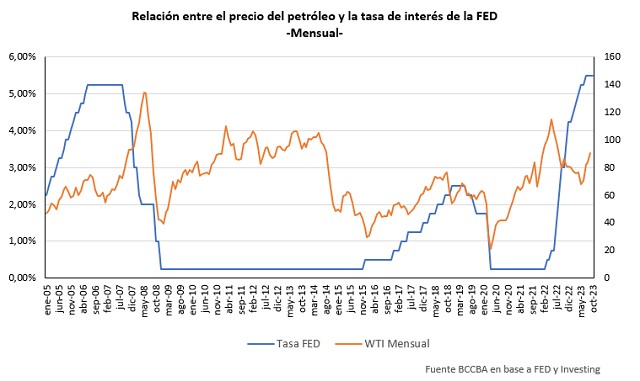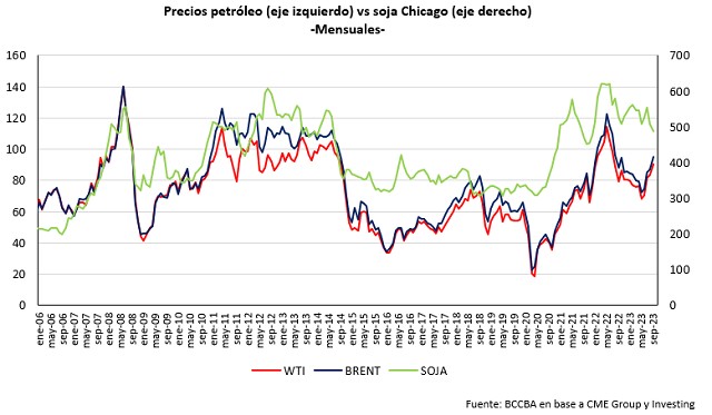 En los últimos meses el petróleo ha mostrado un comportamiento en dirección contraria a lo que se debería esperar en el contexto descripto anteriormente. A pesar de la elevada tasa de interés su precio ha aumentado. En principio, durante octubre el precio mensual baja respecto a septiembre, sin embargo, es importante seguir que comportamiento va adoptando el commoditie ya que factores como el reciente conflicto bélico entre Israel y Hamas, la posición que tomen otros países productores en el oriente medio, sumado a que lo anterior podría incrementar los costos de transporte de petróleo, son variables que podrían influir en los precios a futuro.