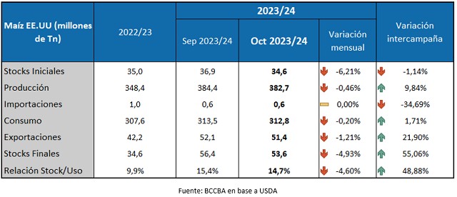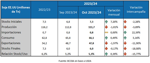 En Estados Unidos la cosecha presenta un avance de aproximadamente el 62% sobre el área, y según el Departamento de Agricultura de los Estados Unidos (USDA), en su última publicación del informe mundial de estimaciones de oferta y demanda (WASDE por sus siglas en inglés) correspondiente al mes de octubre, la hoja de balance para el país norteamericano se caracteriza de la siguiente manera: