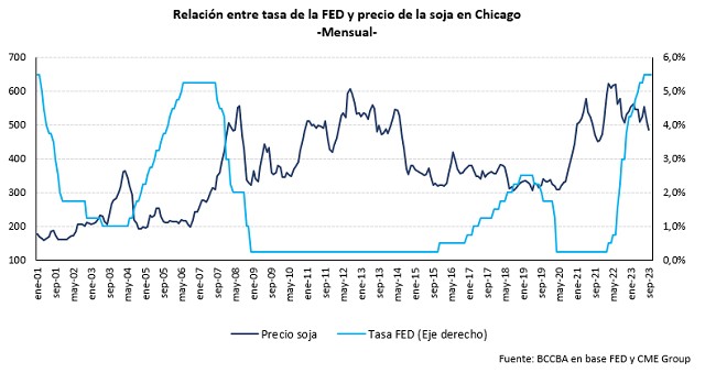 El contexto económico y financiero internacional esta caracterizado por un dólar fuerte, consecuencia de la política monetaria de suba de tasa de interés llevada a cabo por la Reserva Federal de Estados Unidos (FED) como medida contra cíclica para atenuar la inflación. Actualmente la inflación interanual en los Estados Unidos es del 3,7%, siendo el objetivo propuesto por la FED lograr un nivel del 2%, por lo que es de esperar que las tasas continúen en niveles elevados, de no producirse nuevos aumentos. La tasa de interés de referencia se ubica en torno al 5,5%, el nivel más alto en 22 años, teniendo un efecto negativo en los precios debido a un escenario mundial más recesivo y a menores fondos que invierten en commodities a favor de opciones financieras más seguras, lo denominado “fly to quality” o salto a la calidad, quitando liquidez al mercado. Esta situación queda ejemplificada en el siguiente gráfico el cual muestra la relación negativa entre la tasa de referencia de la FED y el precio de la soja.