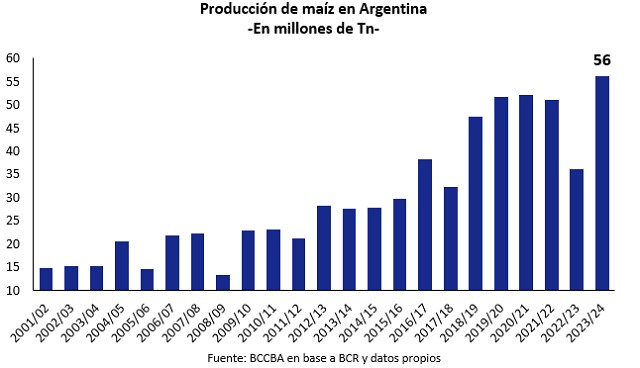 En Argentina, de cara a la campaña 2023/24, la Bolsa de Comercio de Rosario estima un área sembrada de aproximadamente 8,5 millones de hectáreas y en cuanto a producción, se alcanzarían 56 millones de toneladas. Por su parte la Bolsa de Cereales de Buenos Aires estima una producción de 55 millones con un área a sembrar equivalente a 7,3 millones de hectáreas. El USDA, en su último reporte, coincide con la Bolsa de Cereales de Buenos Aires y plantea una producción en torno a los 55 millones de toneladas. El punto para destacar sería que durante esta campaña se producirían aproximadamente 20 millones de toneladas por encima del ciclo previo y de concretarse estas primeras estimaciones la producción Argentina del cereal sería récord.