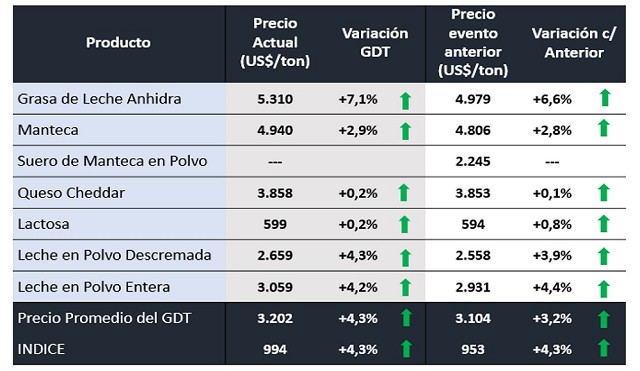 Con este incremento comienza a materializarse el movimiento hacia la apreciación de los precios internacionales, reflejando una mejora en la demanda de productos lácteos, que ya había sido indicada anteriormente por la mayor presencia de China, el mayor comprador mundial de productos lácteos, en las negociaciones de subastas anteriores.