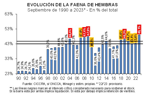 Con estos guarismos, en enero-septiembre del corriente año la participación de las hembras en la faena total llegó a 47,9% (+2,5 puntos porcentuales interanuales). Nuevamente, quedó ubicado por encima del límite superior del intervalo que consistente con el sostenimiento de las existencias bovinas.