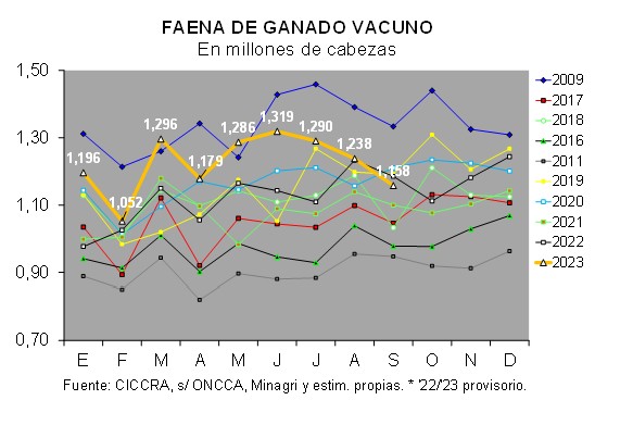 La faena total se ubicó en 1,158 millones de cabezas de hacienda vacuna en el noveno mes del año. La serie corregida por el número de días laborables arrojó una baja de 4,5% mensual.