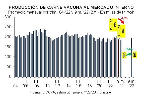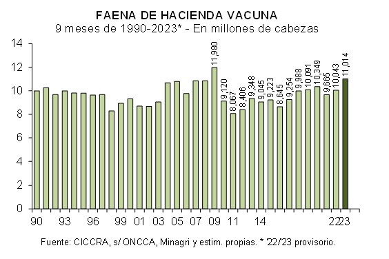En enero-septiembre de 2023 se produjeron 2,494 millones de tn r/c/h de carne vacuna, es decir 6,8% más que en enero-septiembre de 2022 (+159,1 mil tn r/c/h).