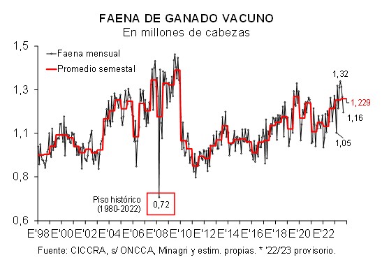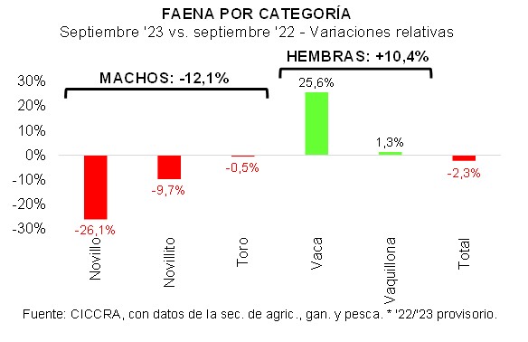 En enero-septiembre de 2023 se faenaron 5,739 millones de machos, 4,6% más que un año atrás. Todo el crecimiento continuó siendo explicado por el mayor número de novillitos sacrificados (+6,4% anual). En tanto, la faena de novillos descendió 3,9% anual.