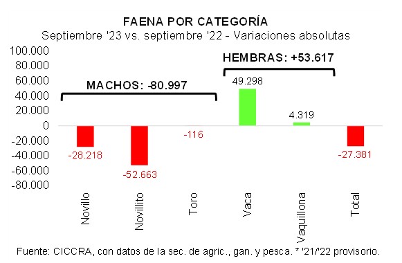 En cambio, en septiembre continuó creciendo la faena de hembras. El total faenado fue de 568,0 mil cabezas y fue 10,4% mayor al de septiembre de 2022 (+53,6 mil cabezas). Fue la creciente faena de vacas la que explicó casi todo el incremento de la faena de hembras (91,9% del total; +25,6% anual; +49,3 mil cabezas). El resto correspondió a vaquillonas (+1,3% anual; 4,3 mil cabezas).