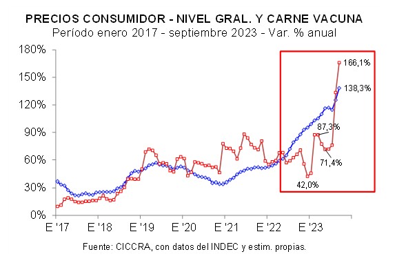 Entre agosto y septiembre del corriente año el capítulo alimentos y bebidas no alcohólicas registró un incremento de 13,2%, producto de un alza también de 13,2% de los alimentos combinada con un aumento de 12,7% mensual de las bebidas no alcohólicas. En el caso particular de la carne vacuna, el ajuste del precio promedio nuevamente superó a los indicadores generales, ubicándose en 16,2% mensual (en el caso de la hacienda en pie, el precio promedio registró una suba de 3,9% mensual).