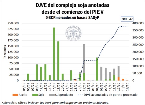 No obstante, tomando en consideración únicamente las Declaraciones Juradas de Ventas al Exterior (DJVE) para embarque dentro de los próximos 360 días, durante gran parte del mes de septiembre se observó que las DJVE anotadas bajo el PIE V eran de poroto de soja sin procesar. Sin embargo, se advierte que hacia finales del mes pasado y lo que va del mes de octubre, el grueso de las DJVE anotadas corresponden a subproductos de la industrialización de poroto de soja.