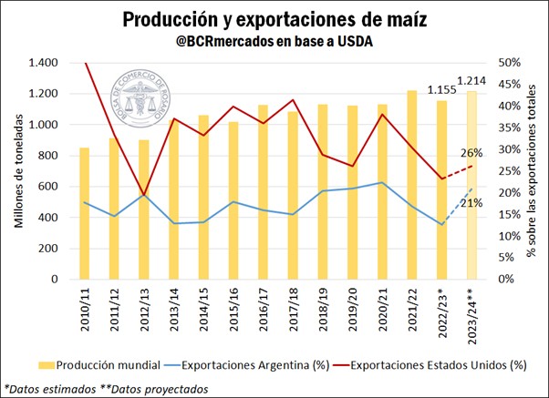 No obstante, se incrementó la estimación de la producción mundial del cereal, principalmente por un aumento de 1,0 Mt en la producción de Argentina debido a la previsión de una mayor área sembrada. De la mano de la mayor oferta, el USDA incrementó en 0,5 Mt la proyección de exportaciones argentinas para la campaña venidera.