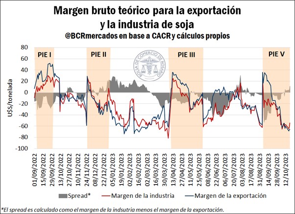 De esta manera, mejoró en términos relativos el spread en favor de la exportación industrial respecto de la exportación del grano, incluso a pesar de encontrarse ambos en terreno negativo. En este contexto y en el marco del PIE V, se vieron impulsadas en las últimas jornadas las ventas al exterior de productos manufacturados de la oleaginosa.