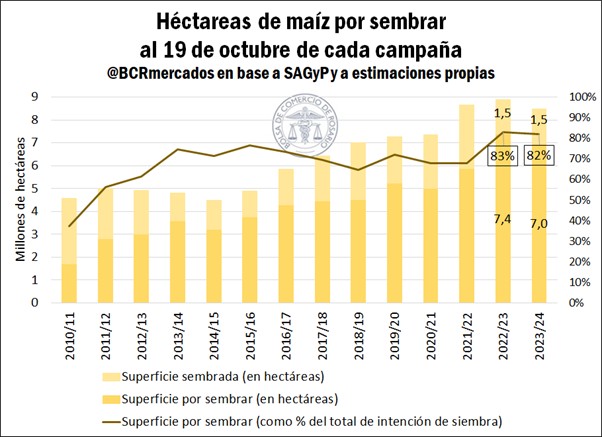 De esta manera, el área por sembrar del cereal alcanza actualmente el 82% de la superficie objetivo, y se muestra como la segunda más alta registrada tanto en términos porcentuales como en términos absolutos, sólo por detrás de la campaña 2022/23. De cumplirse la implantación en el total del área estimada, la campaña 2023/24 será nuevamente una campaña de maíz tardío, posponiendo la cosecha del cereal principalmente hacia los meses de mayo y junio. Sin embargo, parte de estos lotes podrían eventualmente pasarse a soja, considerando el contexto de incertidumbre financiera y climática que rodea la campaña actual, fundamentalmente a continuación de los magros resultados que dejó la campaña 2022/23.