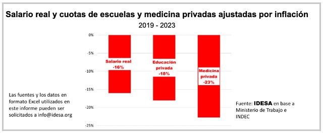 Estos datos muestran que el deterioro es generalizado. Caen los salarios y aún más las cuotas para acceder a los servicios sociales de gestión privada. Ante el empobrecimiento de la clase media –que es la que accede a los salarios formales– resulta muy difícil sostener los ingresos de las escuelas y la medicina privada. Esta caída en los ingresos de servicios educativos y médicos –que son mano de obra intensiva– deteriora las remuneraciones de docentes y profesionales e impacta negativamente en la calidad de los servicios privados.