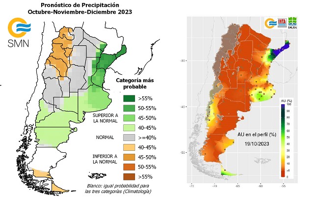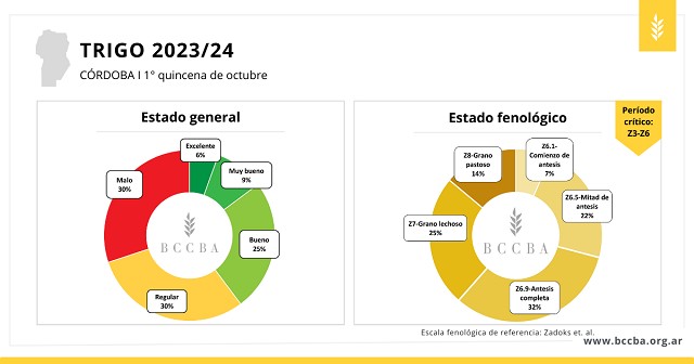 El trigo se encuentra finalizando el período crítico e iniciando el llenado de granos frente a marcadas condiciones de estrés térmico por temperaturas extremas, e hídrico por escasez de precipitaciones y bajas reservas de agua en el perfil. Ante este contexto desfavorable y sostenido, el estado general del cereal empeoró y la proporción de lotes en regular y malas condiciones alcanza el 60 % hacia principios de octubre, lo que representa un aumento de 14 puntos porcentuales respecto del mes anterior. El 25 % de la superficie presenta buenas condiciones, mientras que el 15 % restante, que se encuentra bajo muy buenos y excelentes estados, corresponde principalmente a lotes sembrados bajo riego.