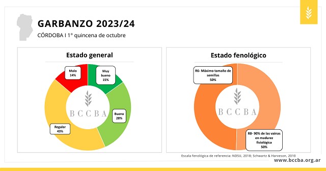A comienzos de octubre, el garbanzo se encontraba terminando su ciclo con más de la mitad de los lotes en regulares y malas condiciones, proporción que evidenció un aumento de 7 p.p. respecto al mes anterior.